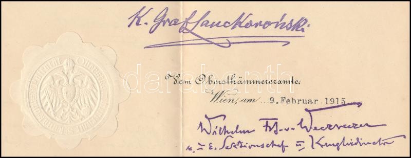 1915 Katonai Érdemkereszt hadiékítménnyel díszített III. fokozatát (Militär-Verdienstkreuz mit der Kriegsdekoration III. Klasse) adományozó okirat, Ludvig Viktor (1874-?), a szabadkai cs. és kir. 86. 'báró Karl von Steininger' gyalogezred (k.u.k. Infanterieregiment ,,Freiherr von Steininger" Nr. 86.) századosa, későbbi tábornok részére, német nyelven, pecsételt aláírással, szárazpecséttel.