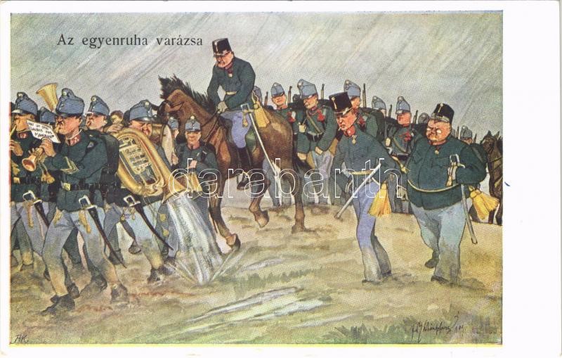 Beschreibung: 1913 Az egyenruha varázsa / Austro-Hungarian K.u.K. military art postcard, officers, music band in the rain. B.K.W.I. 880-12. s: Schönpflug