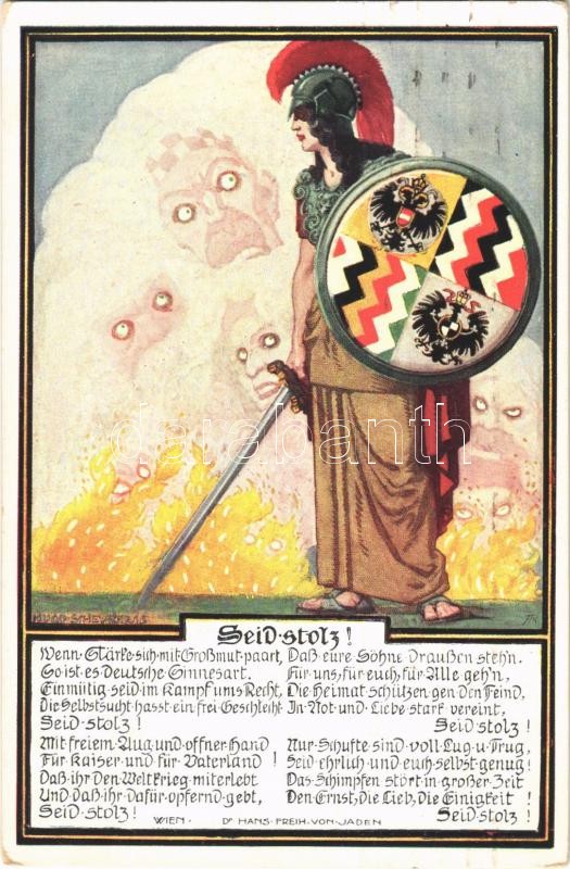 1914 Seid stolz! / WWI German and Austro-Hungarian K.u.K. military art postcard. Offizielle Karte für Rotes Kreuz, Kriegsfürsorgeamt, Kriegshilfsbüro Nr. 115. artist signed (EK)