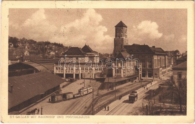 1916 St. Gallen, Bahnhof, Postgebäude / railway station, post office, ... https://www.darabanth.com/de/398-Fernauktion/398.0/Ansichtskarten/Schweiz~1000035/1916-St-Gallen-Bahnhof-Postgebaude-railway-station-post-office-trams-EK~II2409182