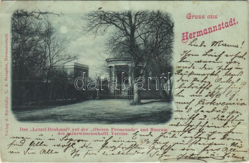 Beschreibung: 1899 Nagyszeben, Hermannstadt, Sibiu; Das Latztel-Denkmal auf der Oberen Promenade und Museum des naturwissenschaftl. Vereins / Latzel emlékmű a felső sétányon, Természettudományi Egyesület múzeuma. G. A. Seraphin / monument, promenade, museum (fa)