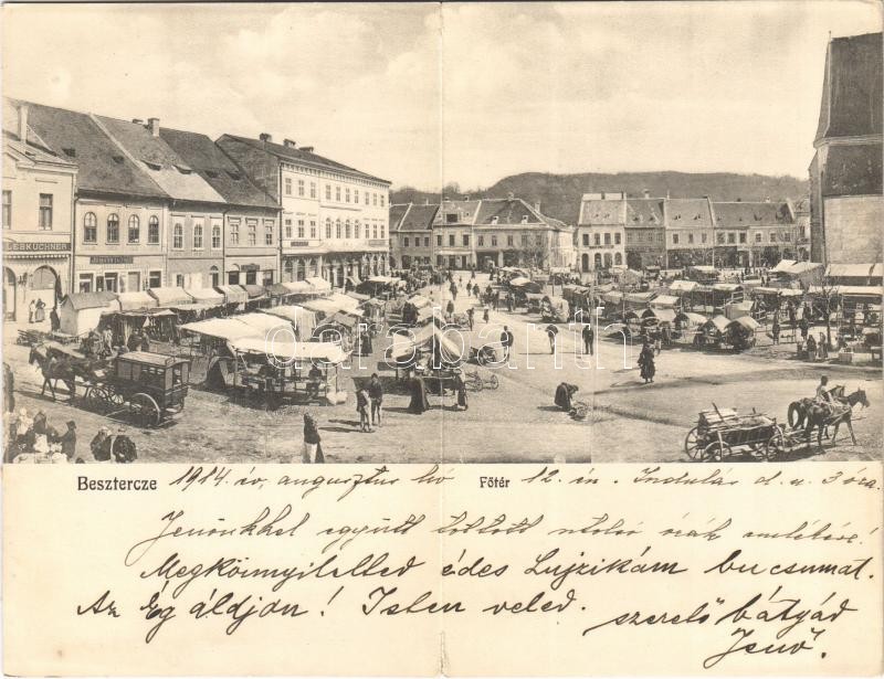 1914 Beszterce, Bistritz, Bistrita; Fő tér, piac, Lebküchner, Johann Lutsch, C.W. Knopp, Binder és Kollmann és Keresztes üzlete. Két részes kihajtható panorámalap. Bartha Mária kiadása / main square, market, shops. 2-tiled folding panoramcard (ragasztónyom / gluemark)