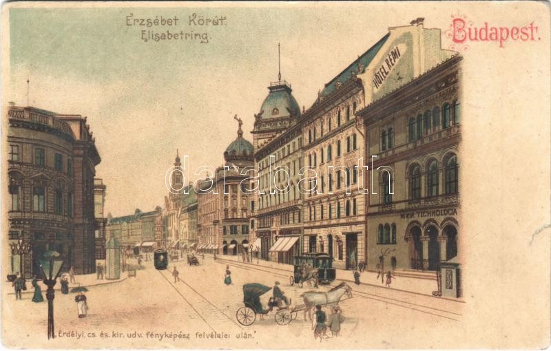 1903 Budapest VIII. Erzsébet körút, villamos, M. kir. Technológiai és Iparmúzeum, Hotel Rémi szálloda. Erdélyi cs. és kir. udvari fényképész felvételei után. litho (r)