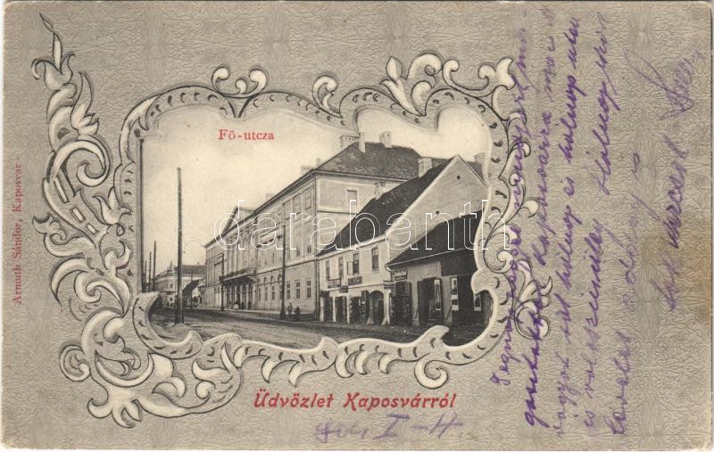 Beschreibung: 1905 Kaposvár, Fő utca, Kéthelyi üzlete. Armuth Sándor kiadása, Art Nouveau