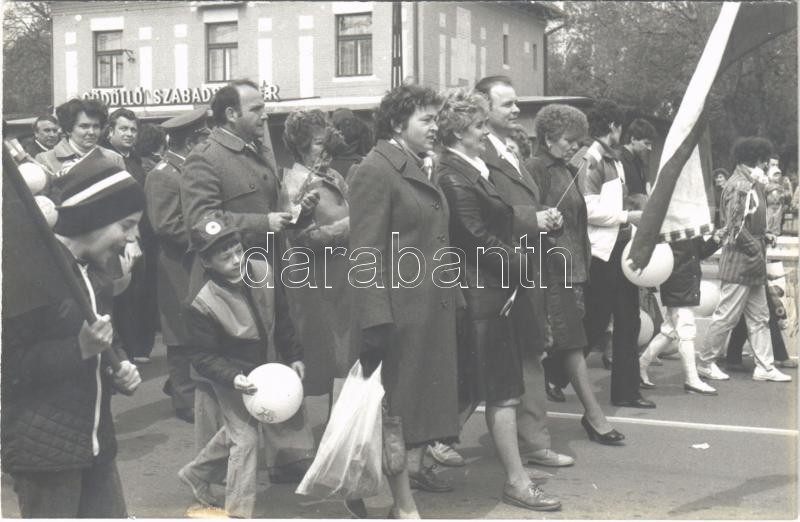 Beschreibung: ~1960 Gödöllő, Szabadság tér HÉV megállóhely, vasútállomás, szocreál felvonulás. photo