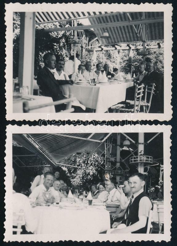 Beschreibung: 1937 Balatonfüred, kirándulás külföldiekkel, asztaltársaság, 2 db fotó, 4,5×6,5 cm