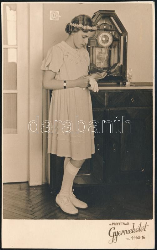 1939 Kislány asztali óra előtt, fotólap, 13,5×8,5 cm https://www.darabanth.com/de/398-Fernauktion/398.0/Fotografie/Foto~500022/1939-Kislany-asztali-ora-elott-fotolap-13-5C3978-5-cm~II2427890