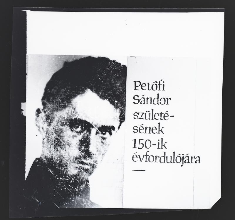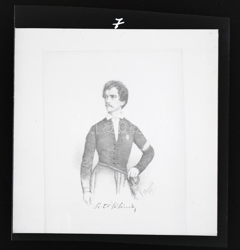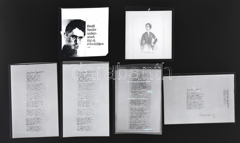 Petőfi Sándor (1823-1849) költő, forradalmár, szabadságharcos portréi (metszet és dagerrotípia másolatban), kézirata és aláírása reprodukálva, Kotnyek Antal (1921-1990) budapesti fotóriporter hagyatékából 6 db NEGATÍV felvétel, 6x6 cm és 9x6 cm