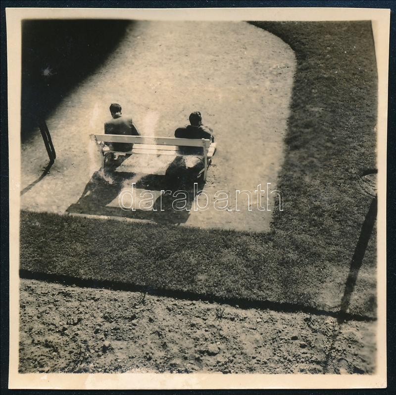 Beschreibung: cca 1936 Kinszki Imre (1901-1945) budapesti fotóművész hagyatékából, jelzés nélküli vintage fotó (ketten a padon), 5,8x5,8 cm