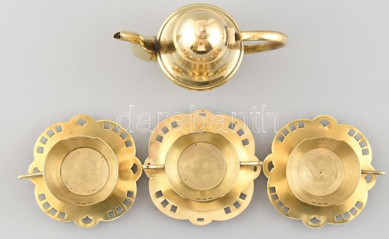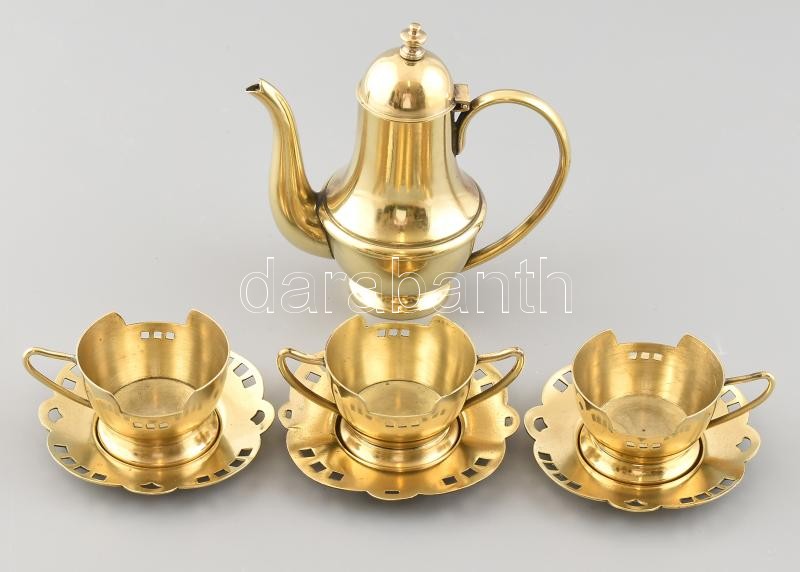 Beschreibung: Art deco réz kávés készlet. Kiöntő alátéttel,pohártartók üvegbetét nélkül, alátéttel.