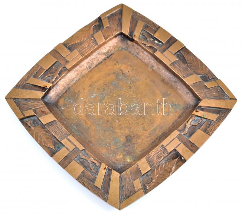Beschreibung: Bán Edit (1905-1966): Iparművész réz tálka vagy hamuzó, peremén levelekkel és geometrikus formákkal díszített, jelzett, kopásnyomokkal, 15,5x15,5 cm