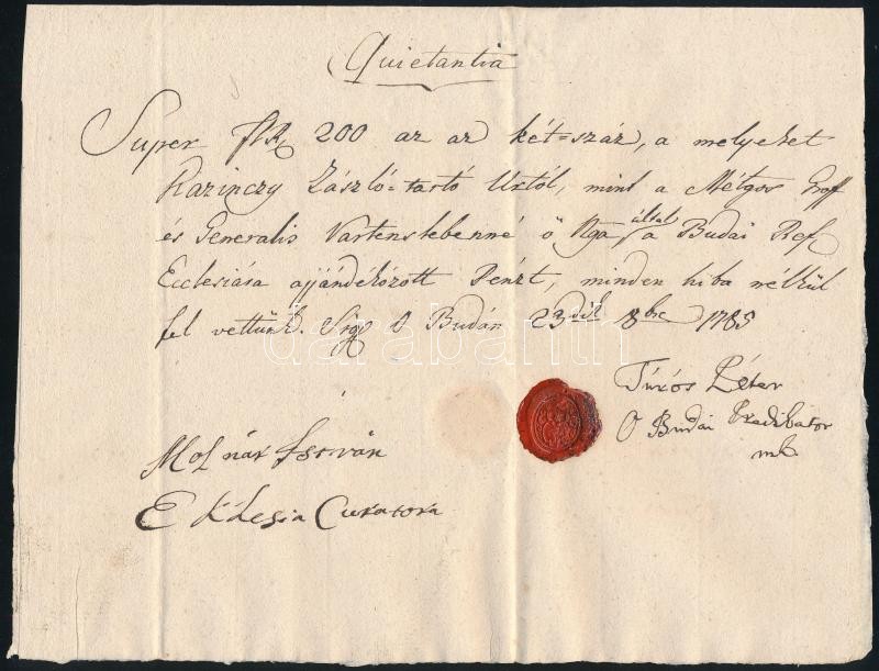 1789 Igazolás 200 forint adomány átvételéről, melyet gróf Wartensleben Károly generális adott az (ó)budai református eklézsiának, aláírva, viaszpecséttel, szép állapotban
