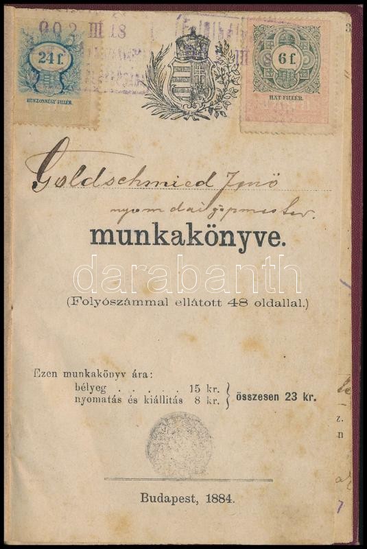 1884 Goldschmied Jenő Mózes hitű nyomdai gépmester munkakönyve https://www.darabanth.com/de/398-Fernauktion/398.0/Kunst-Dokumente-andere-Sammelgebiete/Dokument~500019/1884-Goldschmied-Jeno-Mozes-hitu-nyomdai-gepmester-munkakonyve~II2423716