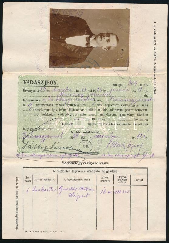 1924-1925 Fényképes vadászjegy Morvay Aladár m. kir. belügyi számtiszt... https://www.darabanth.com/de/398-Fernauktion/398.0/Kunst-Dokumente-andere-Sammelgebiete/Dokument~500019/1924-1925-Fenykepes-vadaszjegy-Morvay-Aladar-m-kir-belugyi-szamtiszt-reszere~II2425838