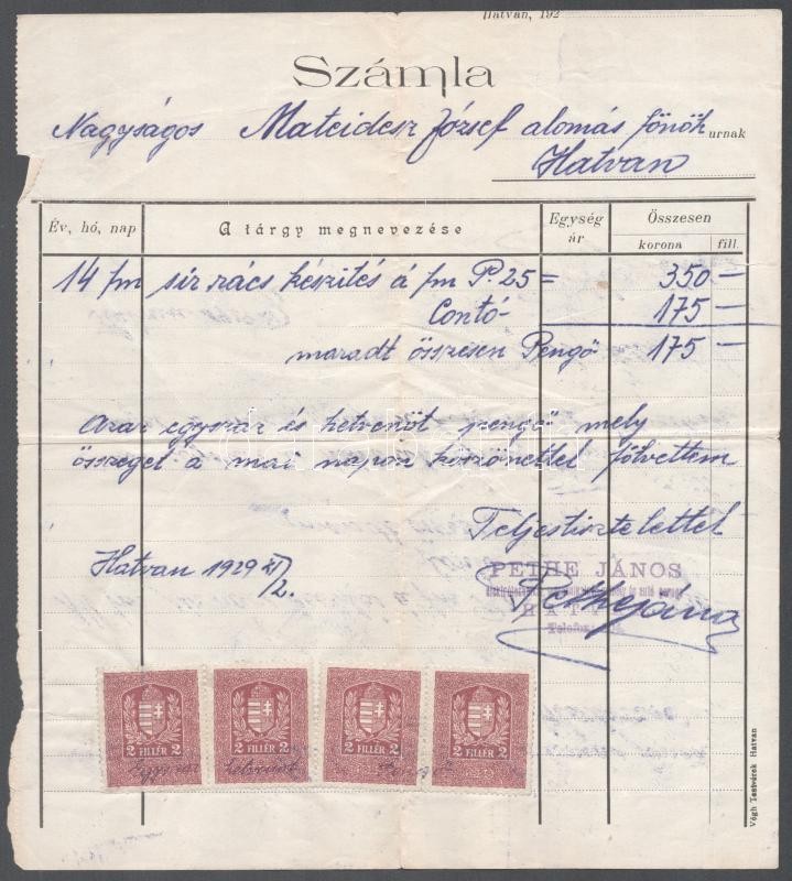 Beschreibung: 1929 Hatvan Pethe János elektronikai mechanikai műhely számla állomásfőnök részére