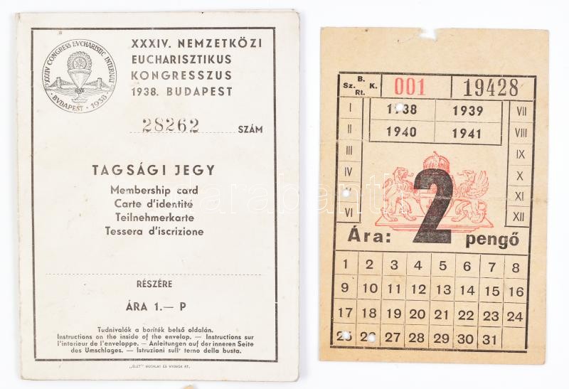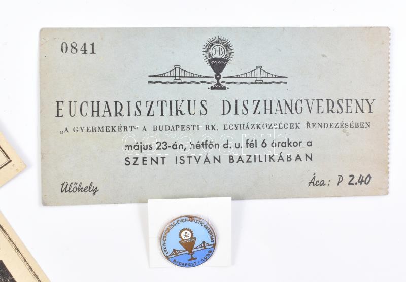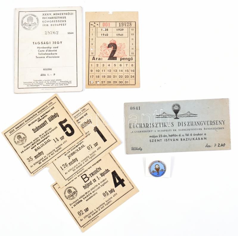 1938 A Budapesti Nemzetközi Eucharisztikus Kongresszusra szóló szett, összesen: 7 db - térképes tagsági jegy, jegyek a megnyitó- és záróünnepélyre, a legátusi szentmisére és a díszhangversenyre, egy BSZKRt. jegy, továbbá kongresszusi tűzzománc jelvény, szép állapotban