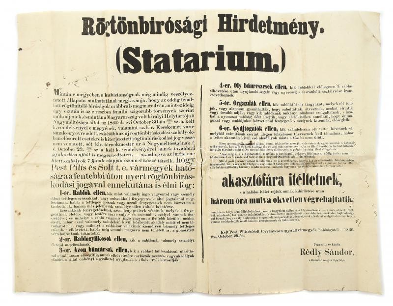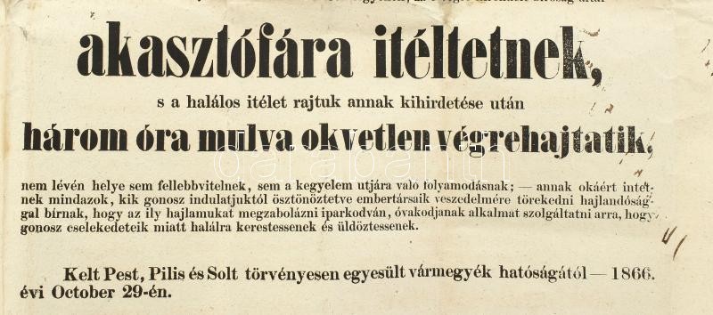 1866 Pest megyei statáriumról szóló rendelkezés nagy méretű hirdetmény... https://www.darabanth.com/de/398-Fernauktion/398.0/Kunst-Dokumente-andere-Sammelgebiete/Drucksachen~500032/1866-Pest-megyei-statariumrol-szolo-rendelkezes-nagy-meretu-hirdetmenye-68x53-cm-hajtva~II2427992