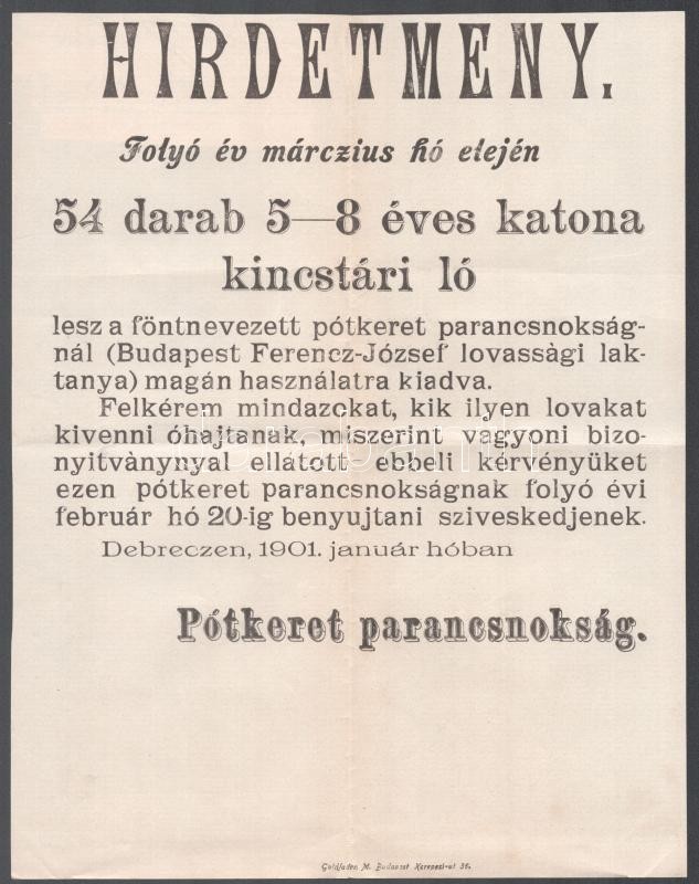 1901 Debrecen katonai pótkeretbe való lovak kiadásáról II. Vilmos 7. h... https://www.darabanth.com/de/398-Fernauktion/398.0/Kunst-Dokumente-andere-Sammelgebiete/Drucksachen~500032/1901-Debrecen-katonai-potkeretbe-valo-lovak-kiadasarol-II-Vilmos-7-huszarezred-22x24-cm~II2428039