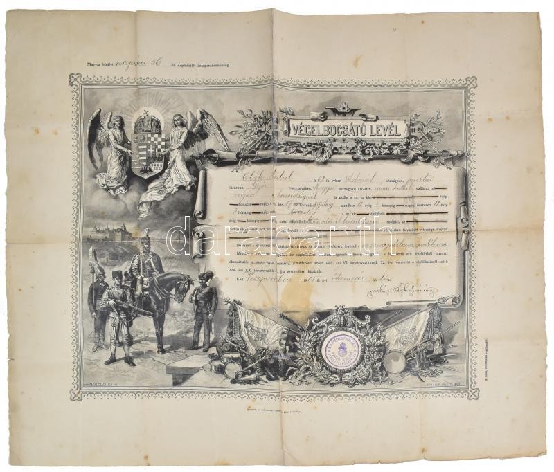 1905 Veszprém, katonai végelbocsátó levél, ragasztott https://www.darabanth.com/de/398-Fernauktion/398.0/Kunst-Dokumente-andere-Sammelgebiete/Drucksachen~500032/1905-Veszprem-katonai-vegelbocsato-level-ragasztott~II2425187