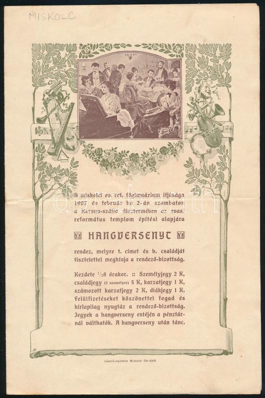 1907 Miskolci ev. ref. főgimnázium ifjúságának hangversenymeghívója https://www.darabanth.com/de/398-Fernauktion/398.0/Kunst-Dokumente-andere-Sammelgebiete/Drucksachen~500032/1907-Miskolci-ev-ref-fogimnazium-ifjusaganak-hangversenymeghivoja~II2425677