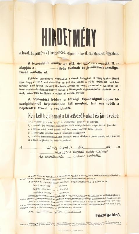 Beschreibung: 1915 Lovak és járművek bejelntésére felszólító hirdetmény plakát 60x90 cm Hajtva, kis beszakadással
