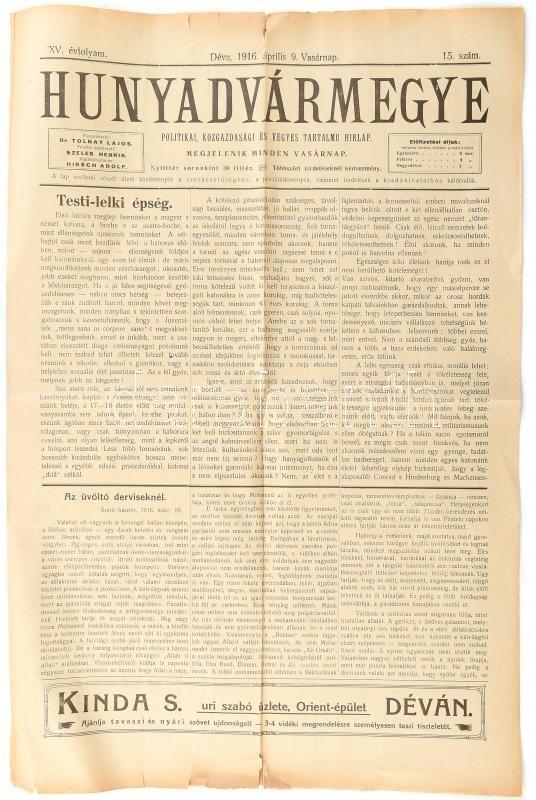 Beschreibung: 1916 Déva, Hunyavármegye politikai, közgazdasági és vegyes tartalmú hetilap XV. évfolyamának 15. száma