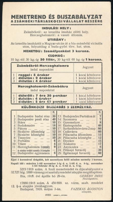 1918 Zsámbéki társaskocsivállalat menetrend és díjszabás 20x11 cm https://www.darabanth.com/de/398-Fernauktion/398.0/Kunst-Dokumente-andere-Sammelgebiete/Drucksachen~500032/1918-Zsambeki-tarsaskocsivallalat-menetrend-es-dijszabas-20x11-cm~II2425518