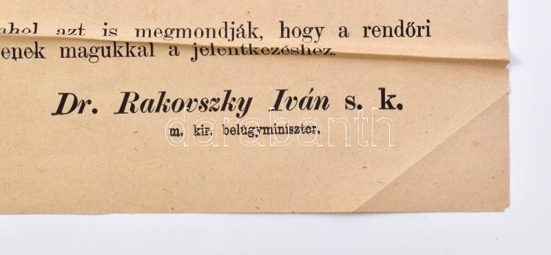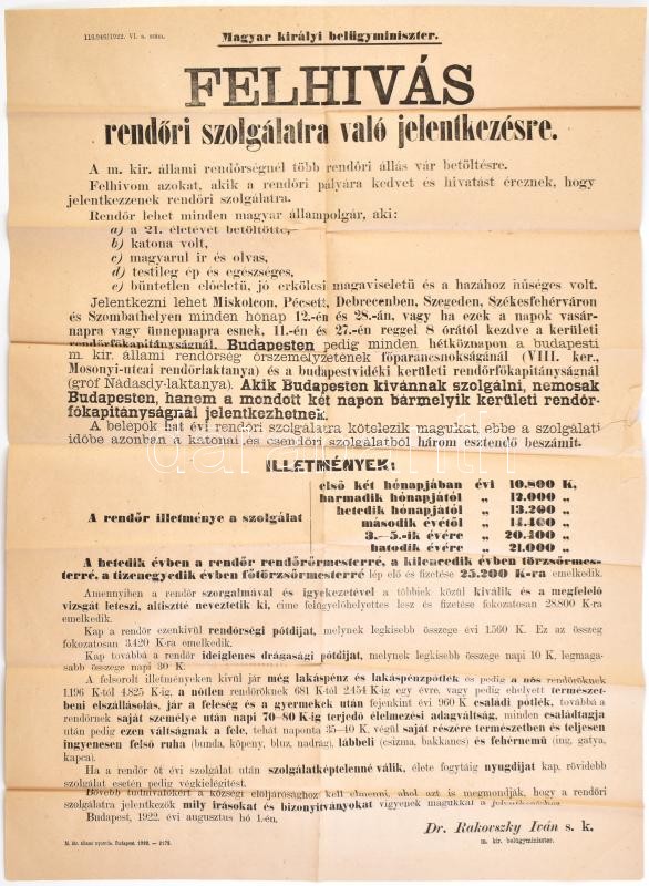 1922 Felhívás rendőri szolgálatra való jelentkezésre. Nagy méretű plak... https://www.darabanth.com/de/398-Fernauktion/398.0/Kunst-Dokumente-andere-Sammelgebiete/Drucksachen~500032/1922-Felhivas-rendori-szolgalatra-valo-jelentkezesre-Nagy-meretu-plakat-hajtva-kis-szaka~II2427917