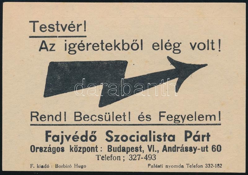 1937 Testvér! Az ígéretekből elég volt! A Fajvédő Szocialista Párt röp... https://www.darabanth.com/de/398-Fernauktion/398.0/Kunst-Dokumente-andere-Sammelgebiete/Drucksachen~500032/1937-Testver-Az-igeretekbol-eleg-volt-A-Fajvedo-Szocialista-Part-roplapja-10x8-cm~II2427847