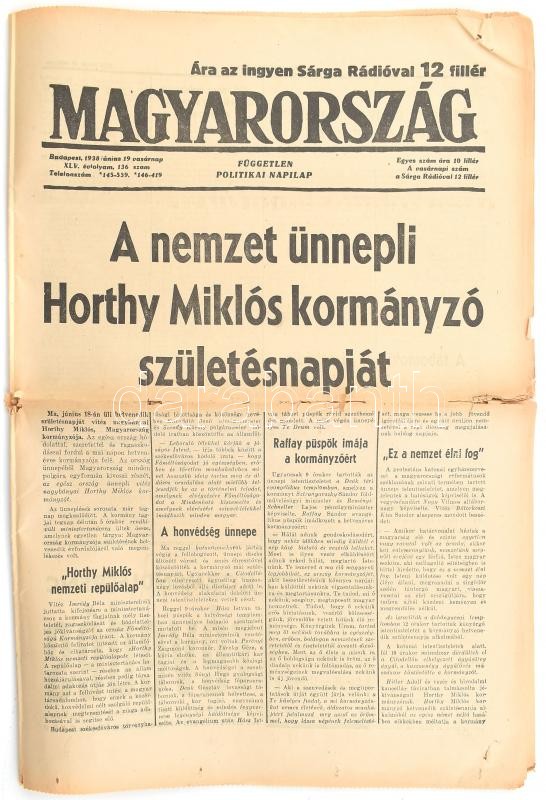 1938 Bp., Magyarország független politikai napilap XLV. évfolyamának 1... https://www.darabanth.com/de/398-Fernauktion/398.0/Kunst-Dokumente-andere-Sammelgebiete/Drucksachen~500032/1938-Bp-Magyarorszag-fuggetlen-politikai-napilap-XLV-evfolyamanak-136-szama-cimlapon-Hort~II2428129