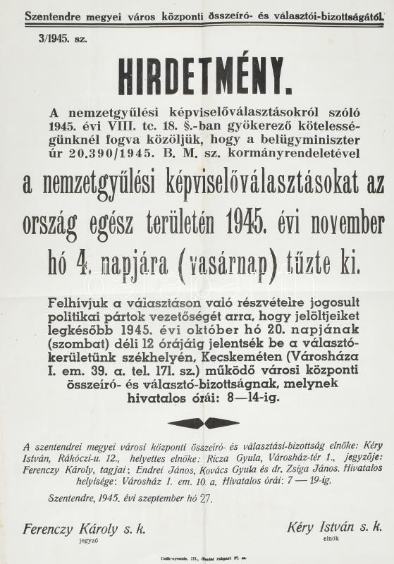 1945 Országos választásról szóló hirdetmény 30x42 cm https://www.darabanth.com/de/398-Fernauktion/398.0/Kunst-Dokumente-andere-Sammelgebiete/Drucksachen~500032/1945-Orszagos-valasztasrol-szolo-hirdetmeny-30x42-cm~II2425606