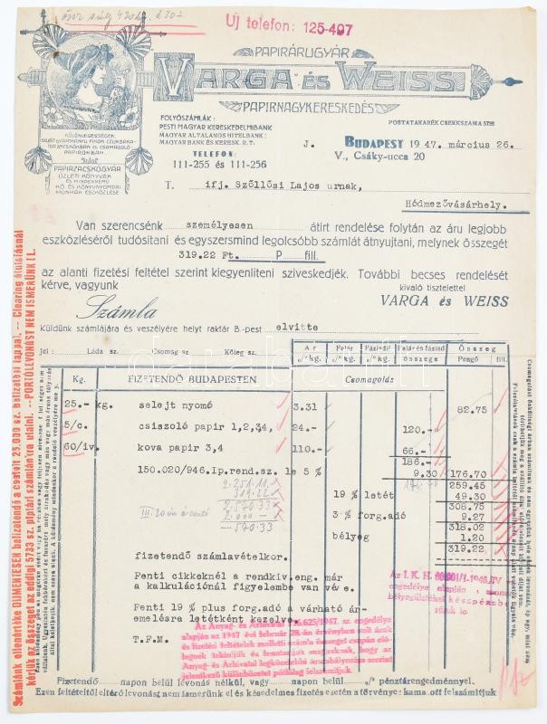 1947 Varga és Weiss Papírárugyár és Papírnagykereskedés számlája dísze... https://www.darabanth.com/de/398-Fernauktion/398.0/Kunst-Dokumente-andere-Sammelgebiete/Drucksachen~500032/1947-Varga-es-Weiss-Papirarugyar-es-Papirnagykereskedes-szamlaja-diszes-fejleccel~II2428045