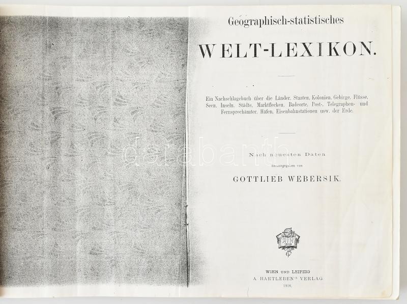Gottlieb Webersik: Geographisches statistisches Welt-lexikon. Wien, Ha... https://www.darabanth.com/de/398-Fernauktion/398.0/Kunst-Dokumente-andere-Sammelgebiete/Drucksachen~500032/Gottlieb-Webersik-Geographisches-statistisches-Welt-lexikon-Wien-Hartleben-1908-as-kiadas-moder~II2424186