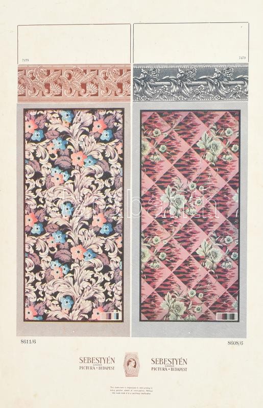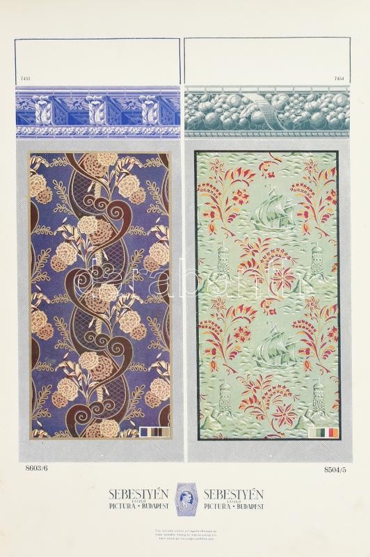 cca 1930 Sebstyén László Pictura, Budapest, 'falminta' (tapéta) áruminta katalógus, kopott, kissé sérült borítóval, sérült, szétvált kötéssel, néhány hiányzó és néhány kijáró lappal. A végén román, német és magyar árjegyzékkel.