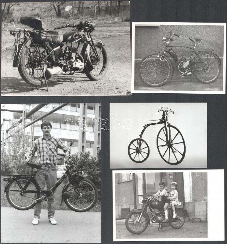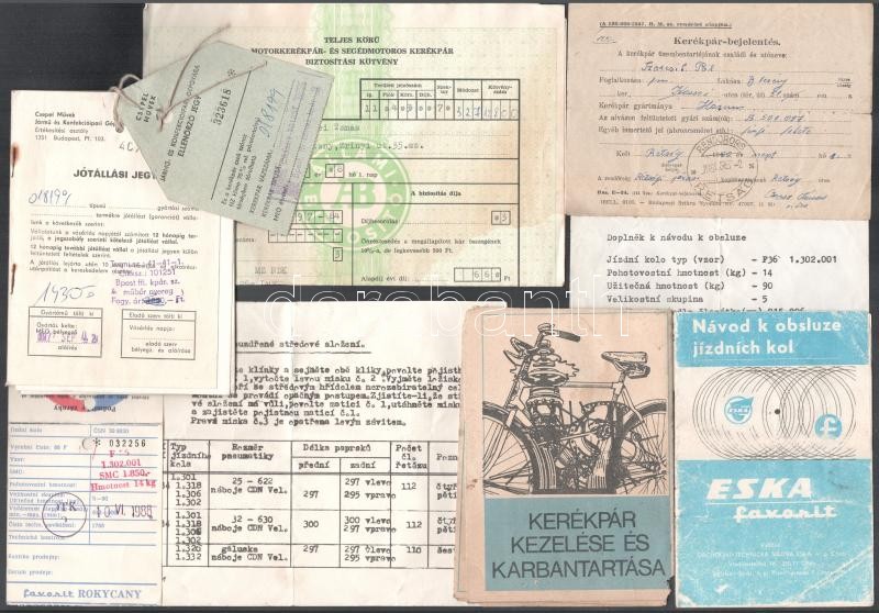 cca 1950-1988 Kerékpárokkal, motorokkal kapcsolatos papírrégiség tétel: jótállási jegy, biztosítási kötvény, útmutatók, fotók, stb., magyar és cseh nyelven
