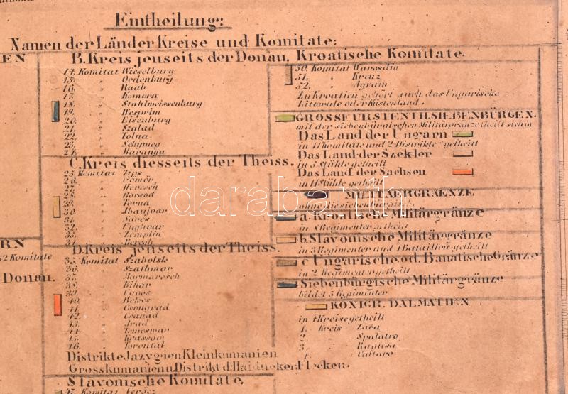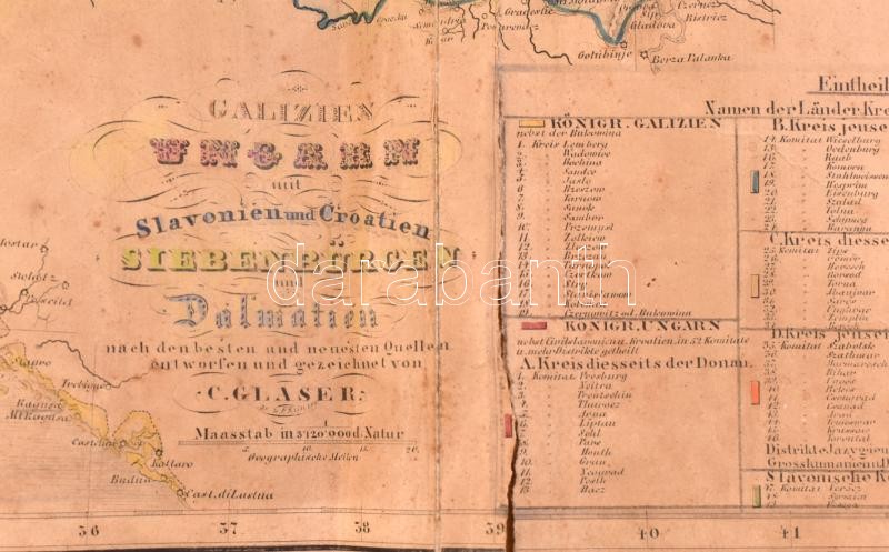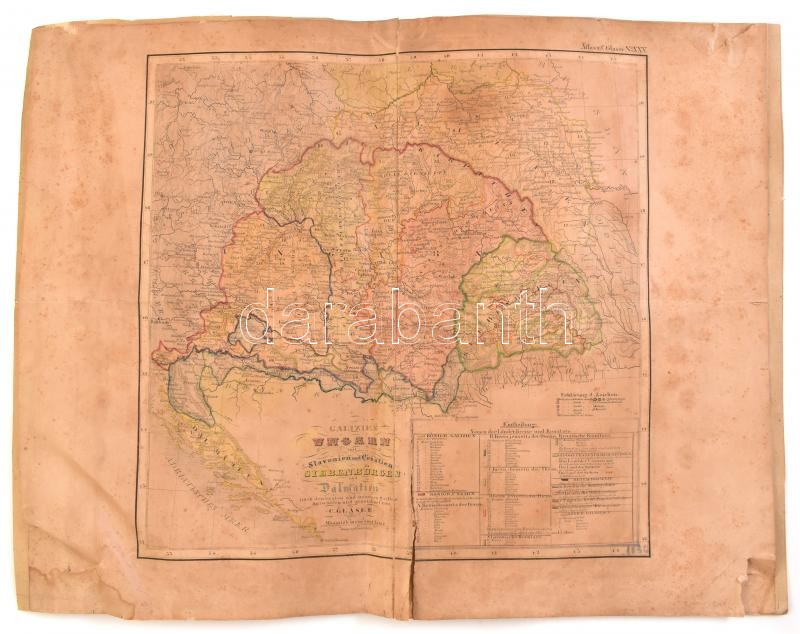 cca 1836 'Galizien, Ungarn mit Slavonien und Croatien, Siebenburgen und Dalmatien', nach den bestern und neuesten Quellen entworfen und gezeichnet von C. Glaser, Atkas v. C. Glaser N. XXV., kézzel színezett rézmetszet, foltos, sérült, részben kartonra erősítve, 32x32 cm