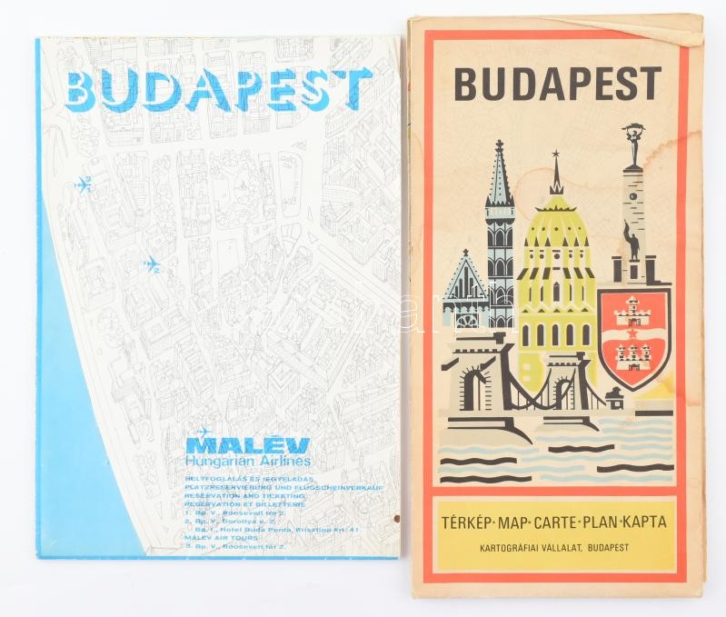 cca 1980 Budapest térkép, rajta "légifelvétel-szerű" illusztrációkkal, Bp., MALÉV, 97x66 cm +1975 Budapest térkép, utcanévjegyzékkel, Bp., Cartographia, foltos, 80x91 cm, (teljes: 80x117 cm.)