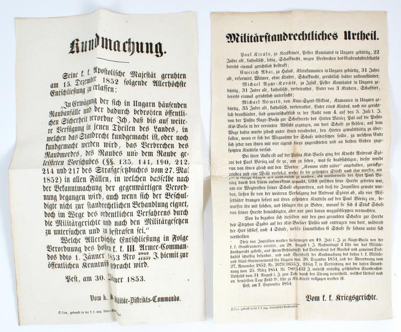 1853 Katonai statárium és körözvény hirdetménye 25x40 cm https://www.darabanth.com/de/398-Fernauktion/398.0/Kunst-Dokumente-andere-Sammelgebiete/Militaria~500029/1853-Katonai-statarium-es-korozveny-hirdetmenye-25x40-cm~II2425609