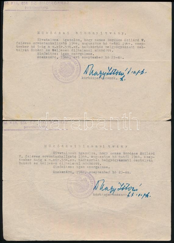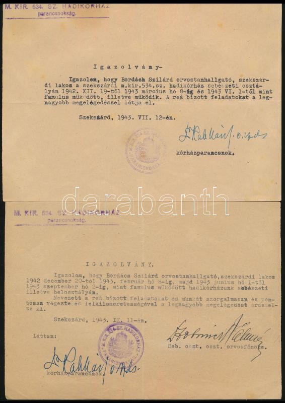 1943-1944 M. Kir. 534. sz. hadikórház parancsnoksága által kiállított ... https://www.darabanth.com/de/398-Fernauktion/398.0/Kunst-Dokumente-andere-Sammelgebiete/Militaria~500029/1943-1944-M-Kir-534-sz-hadikorhaz-parancsnoksaga-altal-kiallitott-4-db-igazolo-irat~II2428909