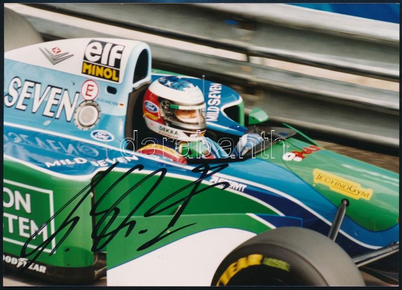 Michael Schumacher (1969-) Formula-1 hétszeres világbajnok autóversenyző aláírása az őt ábrázoló fotón, 18x13 cm / Michael Schumacher (1969-) autograph on photo