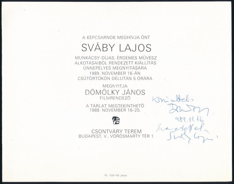 Sváby Lajos festőművész 1989 kiállításának dedikált meghívó levelezőla... https://www.darabanth.com/de/398-Fernauktion/398.0/Kunst-Dokumente-andere-Sammelgebiete/Signatur~500021/Svaby-Lajos-festomuvesz-1989-kiallitasanak-dedikalt-meghivo-levelezolapja~II2428648