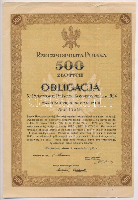 Poland... https://www.darabanth.com/de/398-Fernauktion/398.0/Numismatik/Aktien-und-Tickets~2000005/Lengyelorszag-1926-500Zl-5-os-allami-kolcson-kotveny-TIII-Poland-1926-500-Zlotych-5-S~II2432215