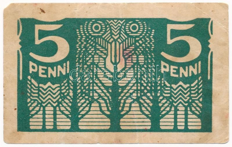 Krause P#39 https://www.darabanth.com/de/398-Fernauktion/398.0/Numismatik/Weltweit-Banknoten~2000013/Esztorszag-1919-5p-TIII-Estonia-1919-5-Penni-CF-Krause-P2339~II2424049