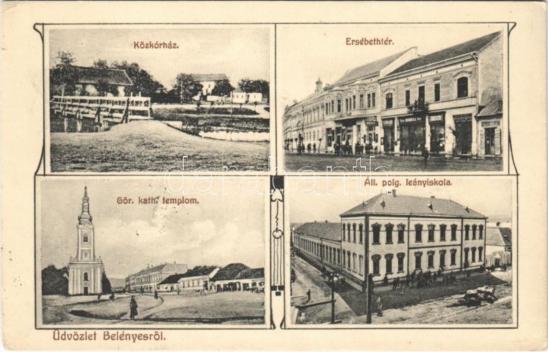 1912 Belényes, Beius; Közkórház, Erzsébet tér, Görög katolikus templom, állami polgári leányiskola, fényképész, fodrász, üzletek / hospital, church, girl school, square, shops. Art Nouveau (EK)