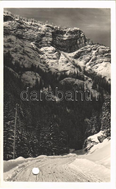 Beschreibung: 1943 Gyergyószentmiklós, Gheorgheni; Gyergyói-havasok, Kis-Cohárd, út télen. Sántha kiadása / mountains, road in winter (lyukasztott / punched hole)