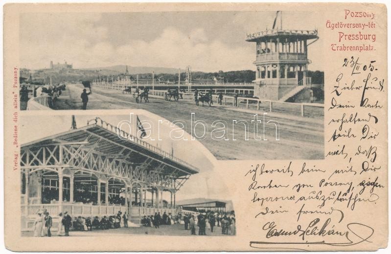 Beschreibung: 1905 Pozsony, Pressburg, Bratislava; Ügetőversenytér, lóversenypálya. Bediene dich allein / hippodrome (EK)
