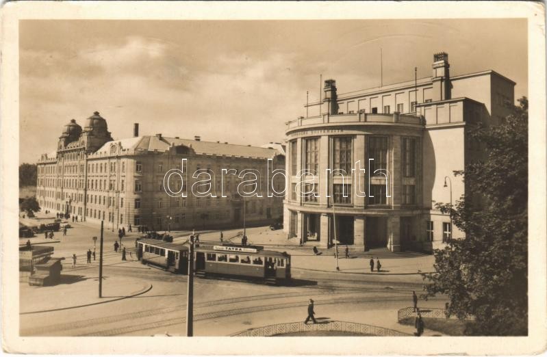 1949 Pozsony, Pressburg, Bratislava; Povereníctvo vnútra, Slovenská univerzita / Szlovák egyetem, villamos Tatra reklámmal / university, tram with advertisement (EK)