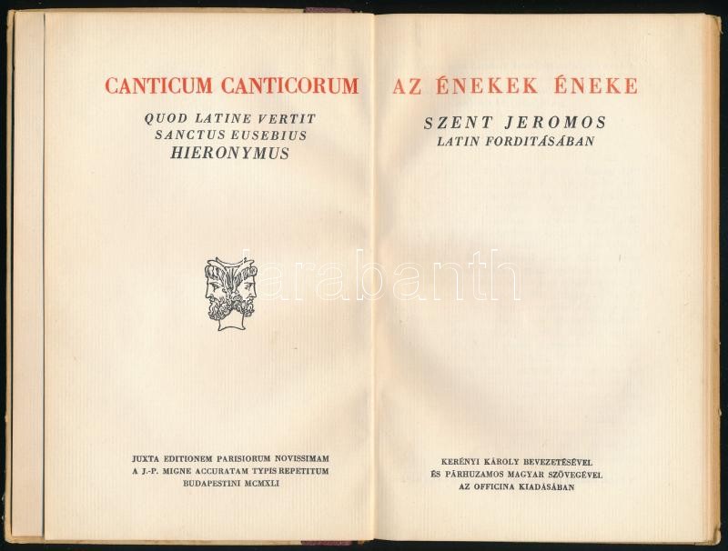 Az Énekek Éneke. Szent Jeromos lain fordításában. Bp., 1941, Officina.... https://www.darabanth.com/de/399-Fernauktion/399.0/Bucher/Bucher-Andere-kuriositaten~1500019/Az-Enekek-Eneke-Szent-Jeromos-lain-forditasaban-Bp-1941-Officina-Felvaszon-kotes-ko~II2440698