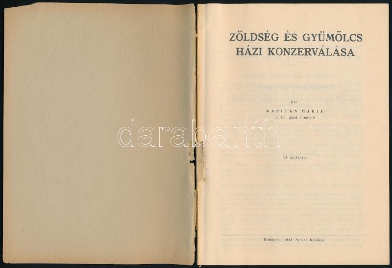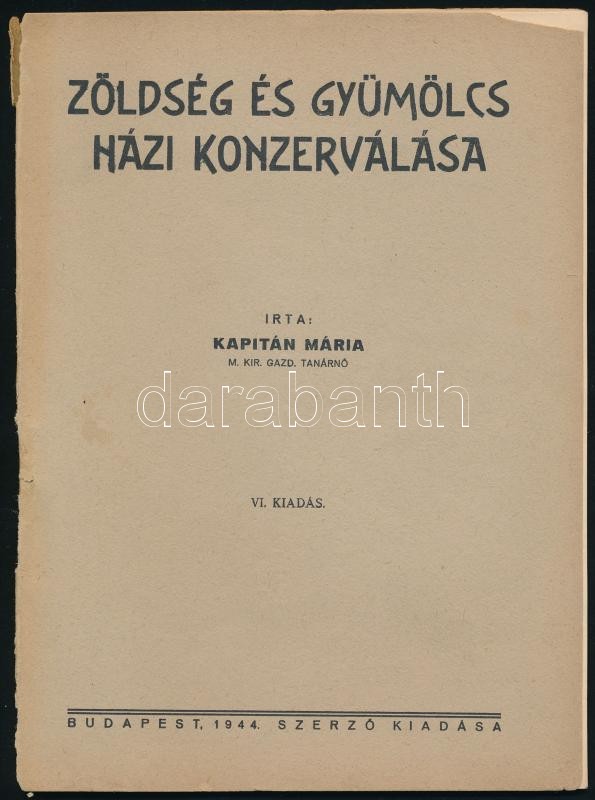 Kapitán Mária: Zöldség és gyümölcs házi konzerválása. Bp., 1944, Szerz... https://www.darabanth.com/de/399-Fernauktion/399.0/Bucher/Bucher-Gastronomie-und-Gartnerei~1500007/Kapitan-Maria-Zoldseg-es-gyumolcs-hazi-konzervalasa-Bp-1944-Szerzoi-kiadas-Ladany~II2442147