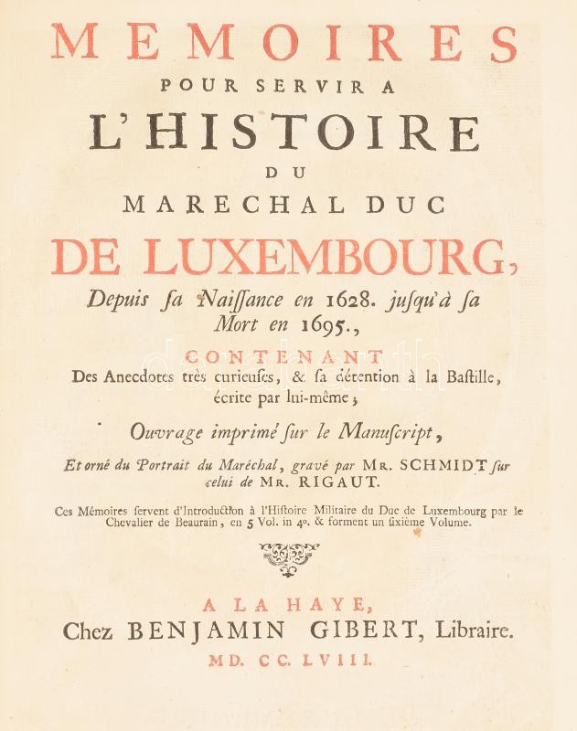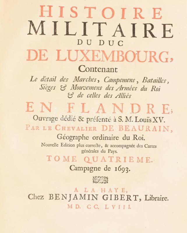 Jean de Beaurain (1696-1771): Histoire militaire du Duc de Luxembourg, contenant le de?tail des marches, campemens, batailles, sie?ges & mouvemens des arme?es du Roi & de celles des allie?s en Flandre; ouvrage de?die? & pre?sente? a? S. M. Loui?s XV. Tome Premier: Campagne de 1690. Tome Second: Campagne de 1691. Tome Troisieme: Campagne de 1692. I-V. köt. Tome Quatrieme: Campagne de 1693. Tome Cinquieme: Campagne de 1694.; Memoires pour servir ? l'histoire du Marechal Duc de Luxembourg, depuis sa naissance en 1628 jusqu'? sa mort en 1695. Le Haye, 1756-1758, Benjamin Gilbert, XVI+90;2+146;2+148;4+144; 4+88+32;10+132 p. Francia nyelven. Korabeli kopott félbőr-kötésben, sérült gerinccel, hiányzó táblákkal./Half-leather-binding, with worn cover, damaged spine, without tables (!), in French language.